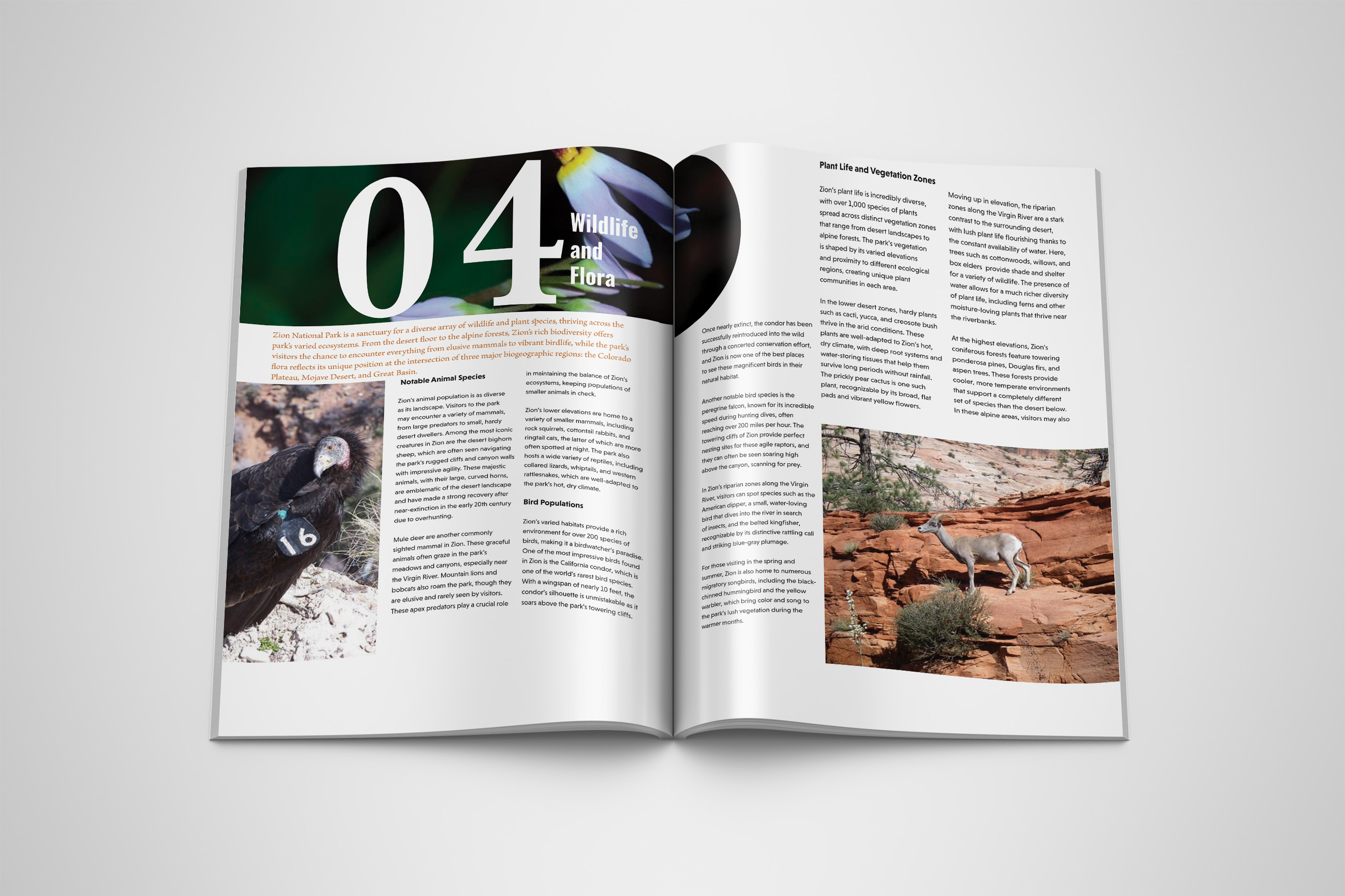 This book spread series showcases chapters from apublication profiling Zion National Park, including Wildlifeand Flora, Attractions and Activities, and Getting Thereand Getting Around. Each spread combines structuredtypographic hierarchy, vivid photography, and spaciouscomposition to guide readers through the park’secosystems, experiences, and accessibility. The designapproach emphasizes clarity and balance, using consistentgrid layouts, warm earthy tones, and engaging imageryto reflect the natural beauty and diversity of Zion whilemaintaining an editorial and educational aesthetic.